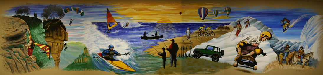 A dentist wanted some of his favorite outdoor sports depicted for this 8'x30' mural in his office; Murphy, TX