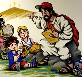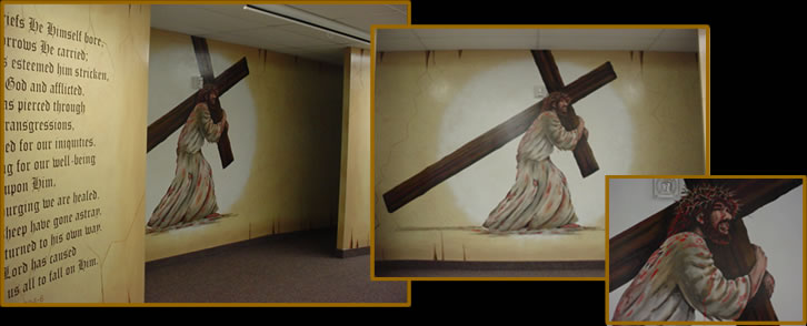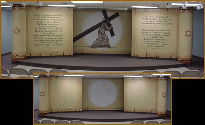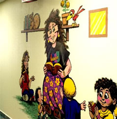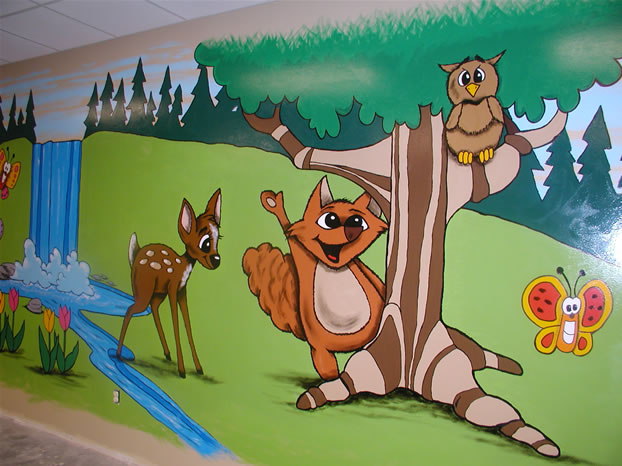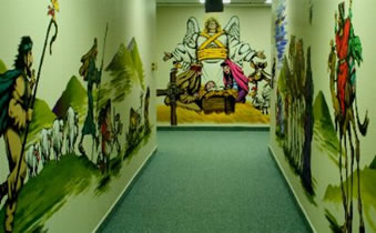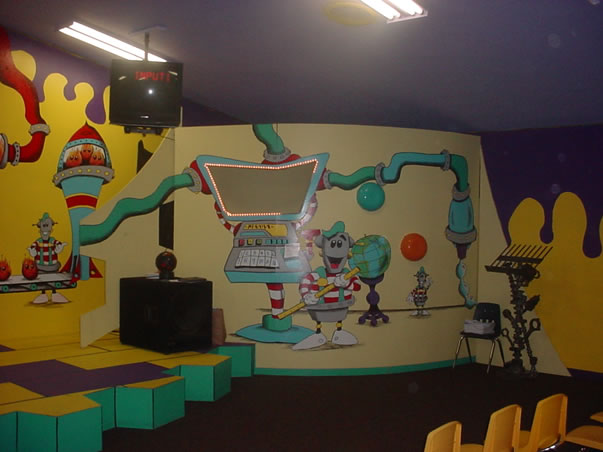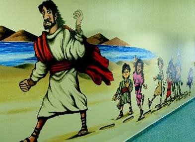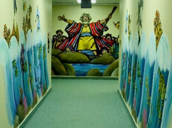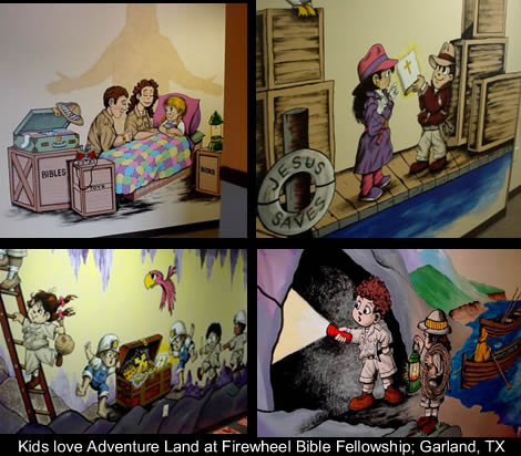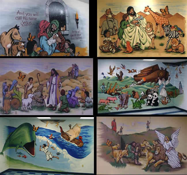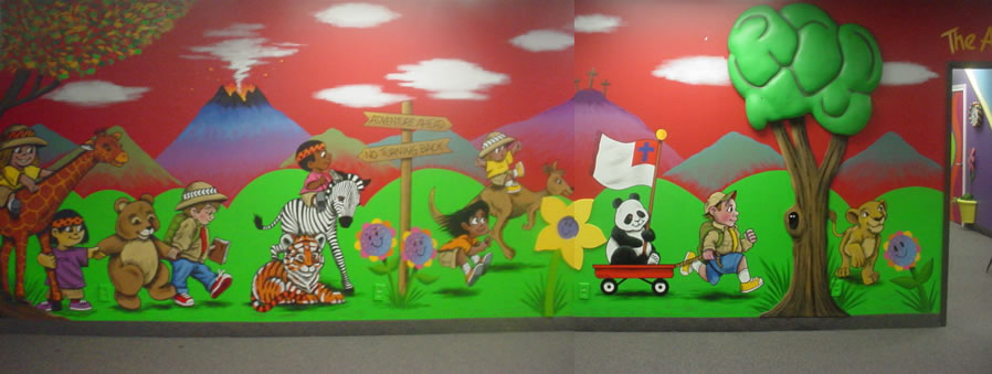 Just 2 of the 26 murals in The Kidzone at Fellowship Bible Church North; Plano, TX. (These murals were adapted from the Read With Me Bible for Children, illustrations by Dennis Jones.)